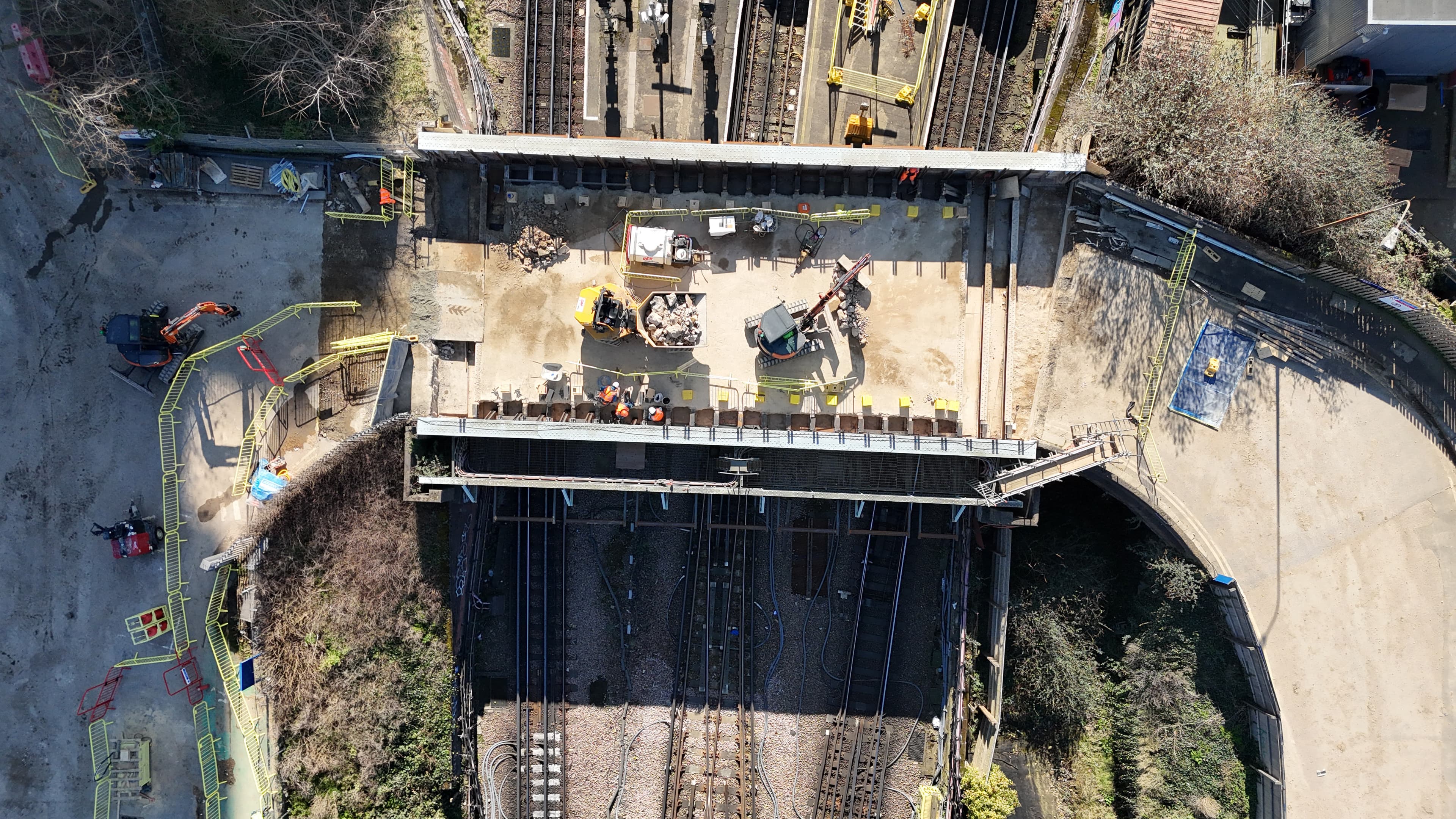 A full trigger level assessment and action plan was agreed for the piling works, with trackside monitoring stations on adjacent buildings and survey points on the retaining wall. The beam installation required a specialist crane and lifting team to position them to millimetre accuracy.